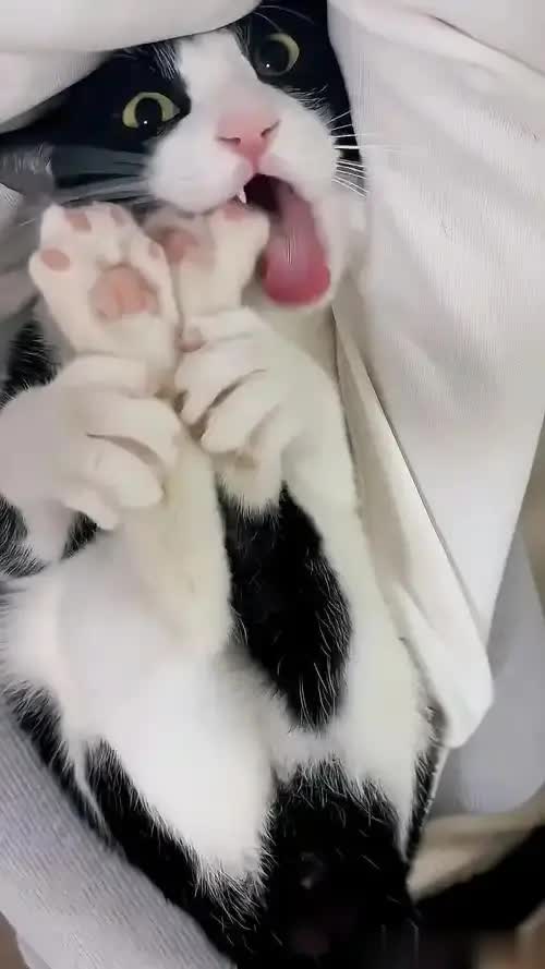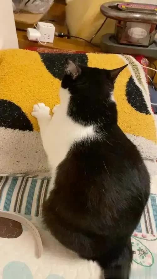 没错,别的猫揣手是静态写真,它这是动态武术——后腿猛蹬自己肚子,力道之大让人怀疑它跟自己的身体有仇。