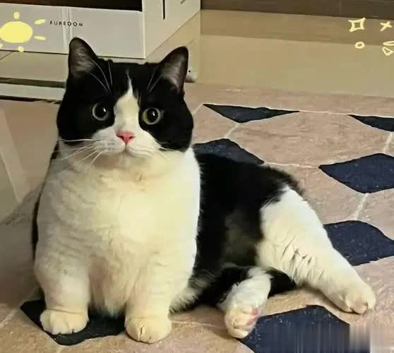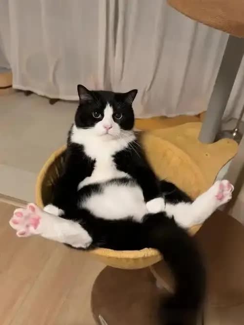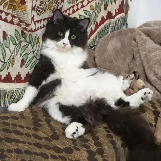 可转头一看奶牛猫——它后腿大剌剌伸着,前爪撑着地,活像蹲在村口晒太阳的老大爷。