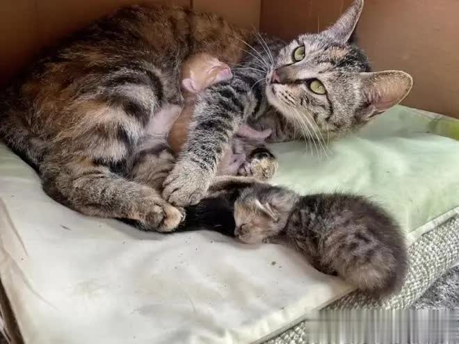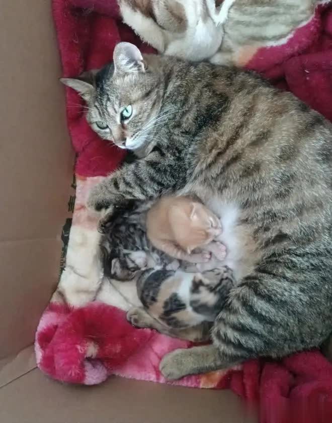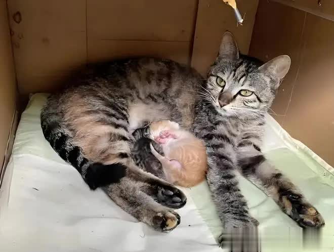 猫咪全家被暂时安置在墙角的纸箱里,猫妈妈始终蹲坐着守护幼崽,目光追随着女子的每个动作。
