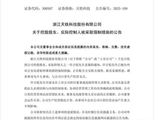 再说另一家天铁科技。这家公司主要做橡胶制品,特别是轨道交通用的减振降噪材料,听着挺专业。股价前阵子回调了三个多月,现在才七块钱左右。昨天大盘和很多股票都在涨,它偏偏还跌了两个点,抄底的人心里肯定在想:这回总该反弹了吧?结果晚上公告来了,控股股东兼实控人之一许吉锭被台州市公安局刑事拘留了。
