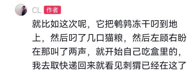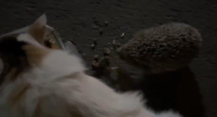 没一会儿,小刺猬就颠颠地跑来吃饭了,猫咪心想:我虽然是流浪猫,但我的刺猬不算流浪刺猬哦。