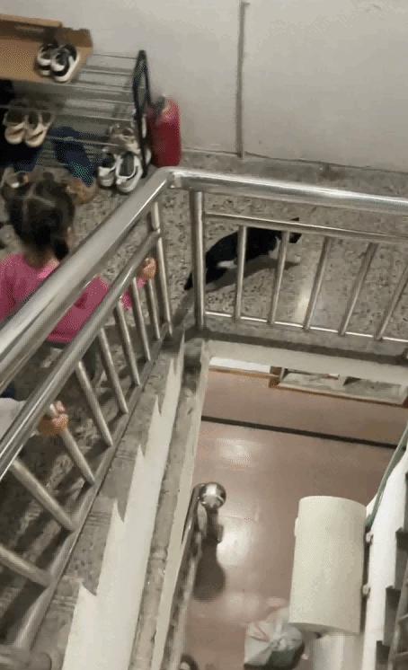 家长好说歹说的把小家伙带出门,但它显然没玩够,死活不愿意回家,走到楼梯口,趁家长没有防备,抱着扶手死活不走,那模样像极了小时候在同学家没玩够的我。