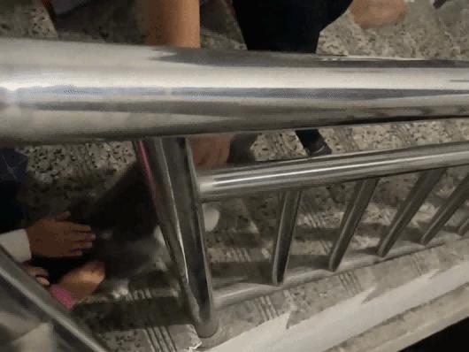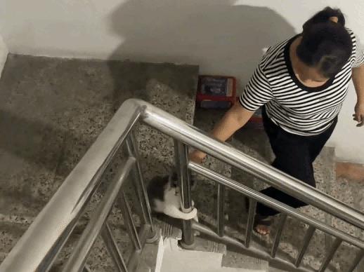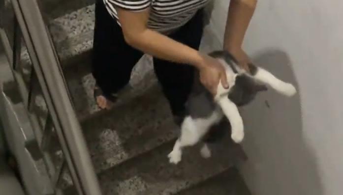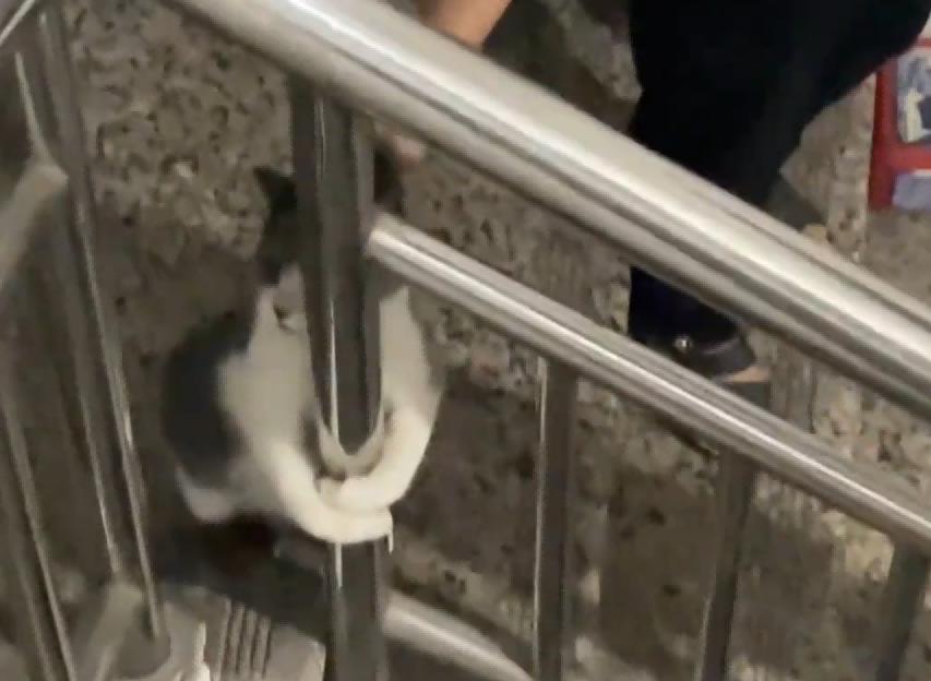 本想直接拎回家,结果家长一个没注意,小蓝白又抱在柱子上不想走,家长把它往下拽,它就抱住下一个台阶的柱子,死活还是不想走。