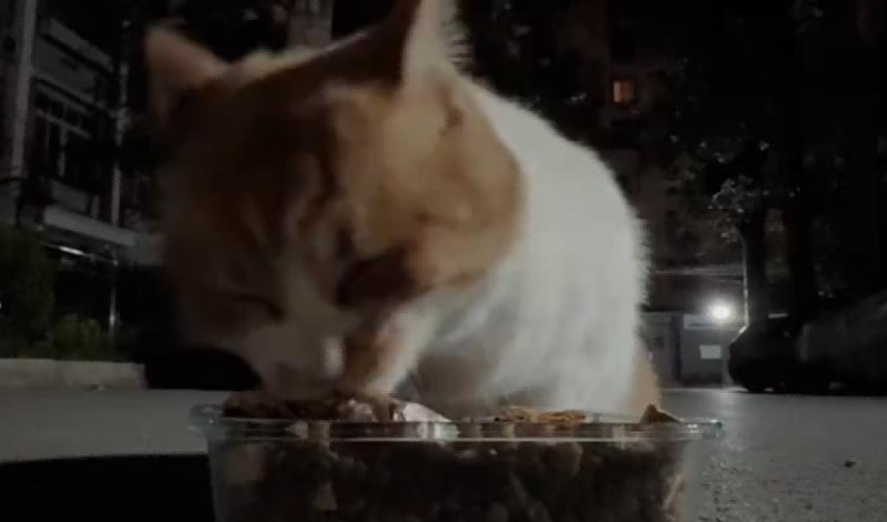 隔天小哥才发现,每次他给大橘拿来猫粮,大橘就会把冻干和猫粮叼出来一些放在地上,左顾右看,确认四周安全后,就蹲在那儿“喵喵”叫几声。